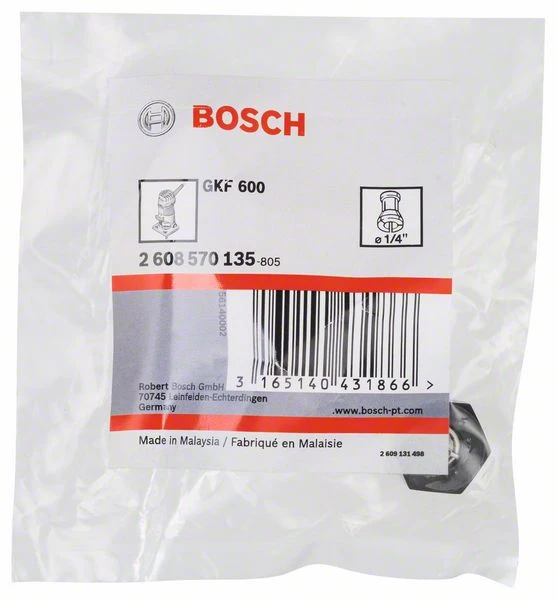 Die Spannzange hält Fräser und ist mit der Kantenfräse GKF 600 Professional von Bosch kompatibel. Durchmesser Zoll: 1/4, Passend zu: GKF 600 (0 601 60A 1..) Professional.
